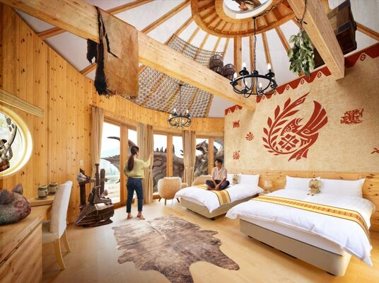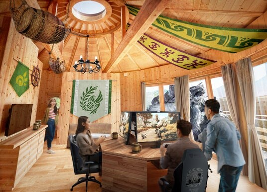 「ニジゲンノモリ」内のグランピング施設「GRAND CHARIOT 北斗七星135°」の一棟を「集会所のコクーン」をテーマに、ゲーミングルームとして装飾。みんなで集まって、ゲームの世界に没頭し、現実でも狩りに出かけよう。