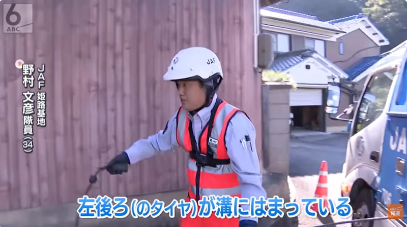 ところ変わって、こちらは姫路市のJAF姫路基地。入社10年目の野村文彦隊員(34)が、依頼を受けて市内の現場へと向かいます。依頼者の男性によると、知人宅の駐車場にバックで停めようとして失敗し、左後輪が側溝にはまってしまったとのこと。