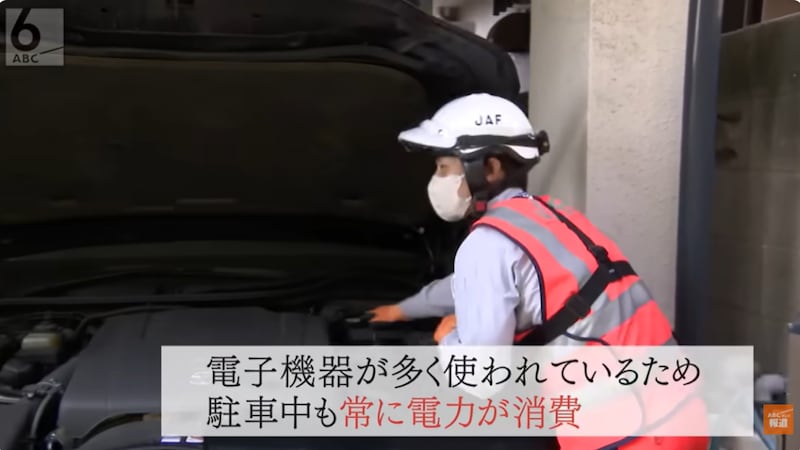 最近の車はカーナビやドライブレコーダーなどの電子機器が多く、駐車中も常に電力が消費されているため、定期的にエンジンをかけないと動かなくなることが。柿崎隊員は小型電源をつなぎ、わずか10分で車を復活させました。