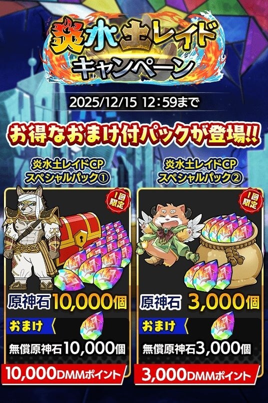 キャンペーン期間中、原神石がおトクに購入できる「炎水土レイドキャンペーンスペシャルパック」が2種登場!さらに原神石に加えて、ガチャチケットや限界突破アイテムなど、お好きなアイテムを選択できる「炎水土レイドキャンペーンセレクトパック」も2種登場!