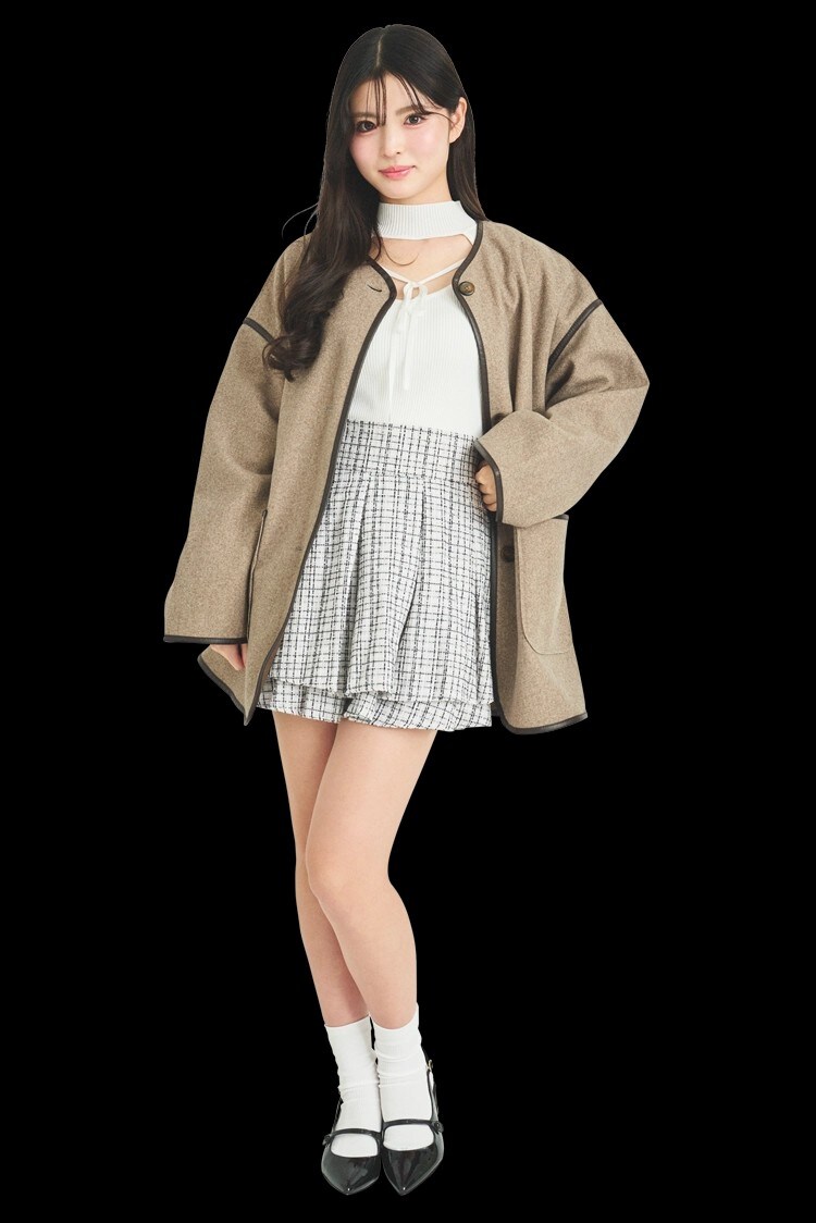 「全体的にアイテムの色が地味で、顔が暗く見えてしまうのが残念です!スカートとブーツが同系色なので、下半身にもう少しメリハリをつけてあげるとバランスがよくなると思う」