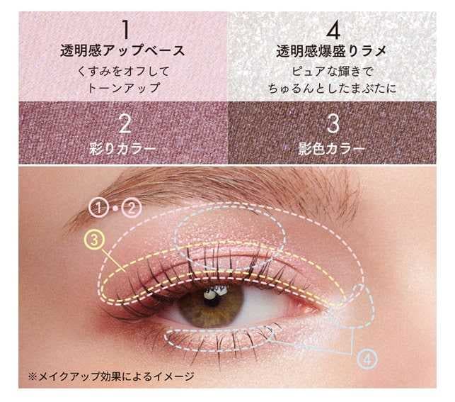全色にブルーパールを配合し、重ねても濁らず“澄んだ目もと”をキープします。なめらかな感触でまぶたにしっとりフィットし、ピュアな発色と美しいツヤ感を両立。
