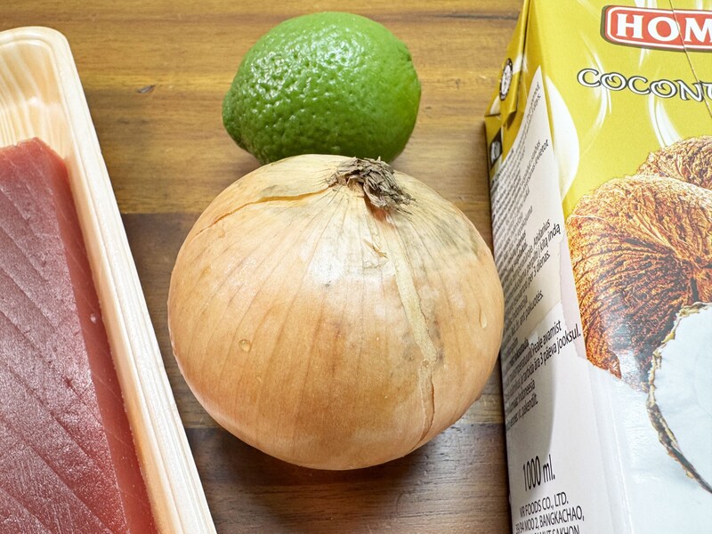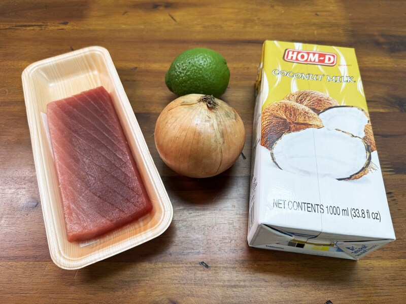 マグロをブロック状にぶつ切りにします。ナウルの食堂では、お店ごとにカットの大きさが違うようですが、筆者がお気に入りの食堂「Coconut Tree Restaurant」(FWJ9+56H, Nibok, Nauru)のスタイルで、やや大きめに、ワイルドにカットしました。