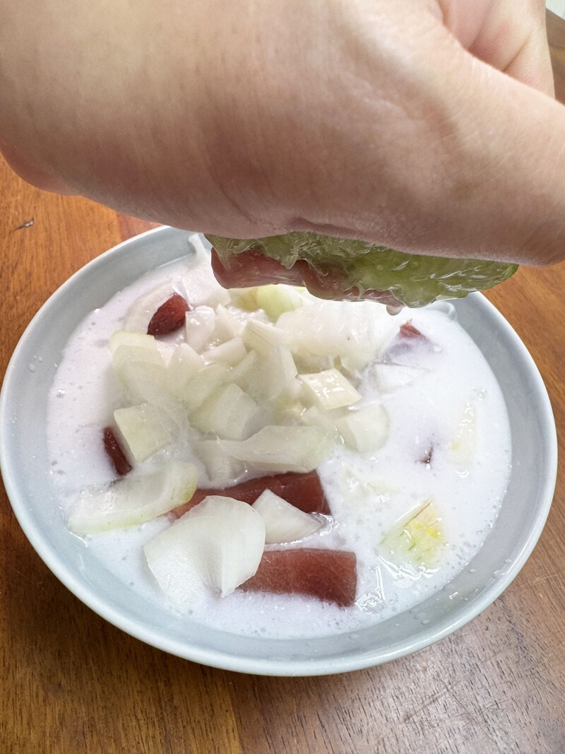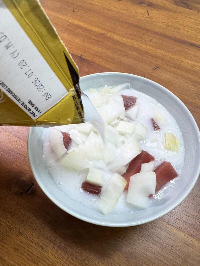 ココナッツミルクはしっかりと振って、油分とココナッツがしっかりと一体化させてからかけましょう。固形のココナッツミルクが入ると、美味しさが損なわれると思います。サラサラの100%液体のココナッツミルクをかけましょう。