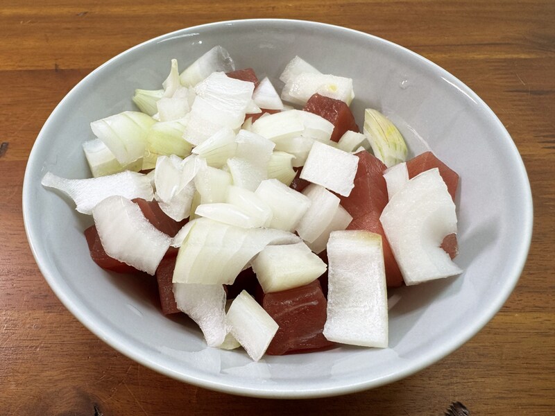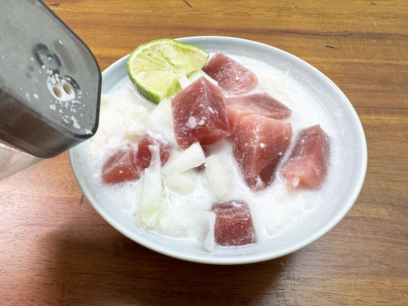 ということで、追加してライムを入れまくったのですが、それでも、酸味の質が違う気がします。もっとギュンギュンくる酸味。その酸味に包まれたマグロの濃い旨味こそ、ココナッツフィッシュの魅力(だと思っています)。もしかして、ライムのほかにレモンを入れたほうがイイ?