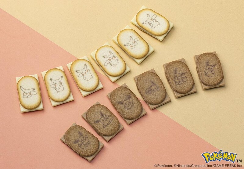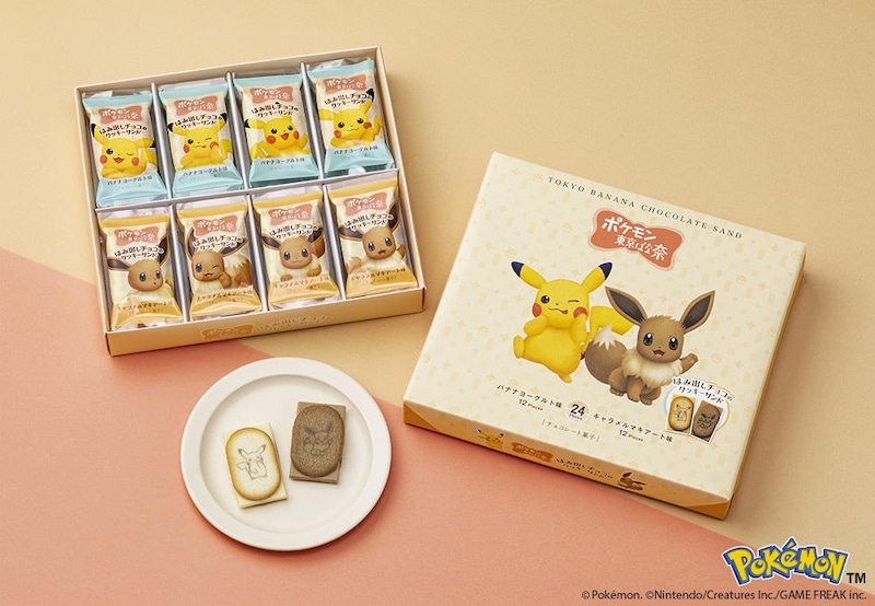 バナナヨーグルトチョコレートをサンドしたクッキーにはピカチュウの絵柄、キャラメルマキアートチョコレートをサンドしたクッキーにはイーブイの絵柄がそれぞれ描かれています。