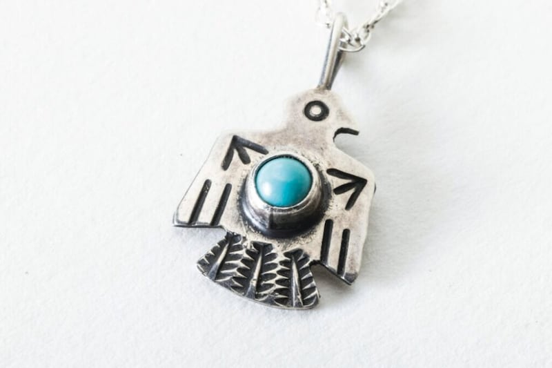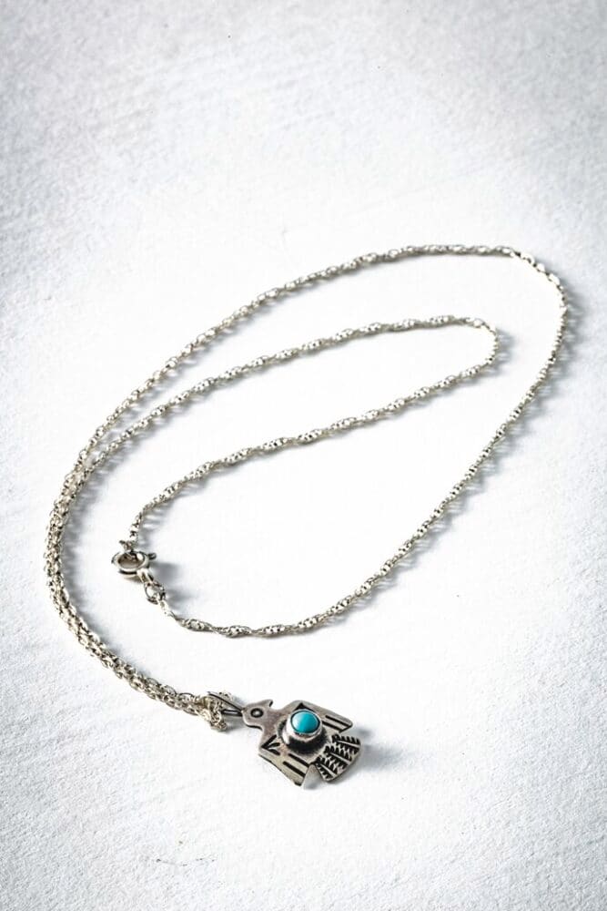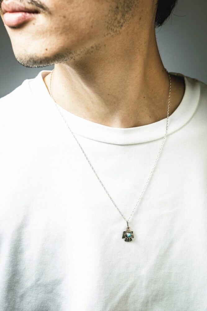 ナバホ族がハンドメイドで作ったスターリングシルバー製のペンダントヘッドで、モチーフとしては定番のサンダーバードですが、キュートな顔と、思わず「ちゃん付け」したくなるほどの小ささに惹かれて購入。