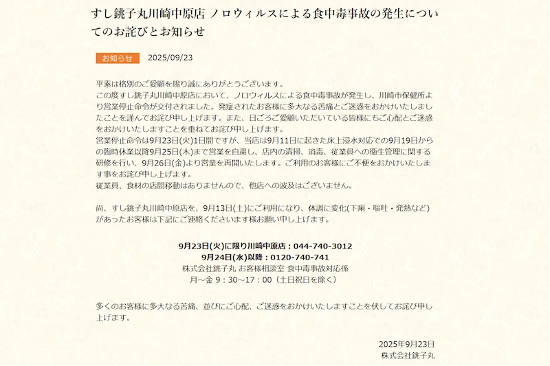なお、すし銚子丸はホームページ上で「発症されたお客様に多大なる苦痛と、ご迷惑をおかけいたしましたことを謹んでお詫び申し上げます」と謝罪した。