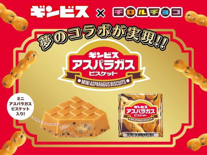 チロルチョコとギンビスのコラボレーションによって、長年愛されてきた「アスパラガスビスケット」がチョコレートと出会い、新たな魅力を放っています。