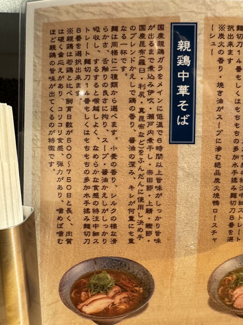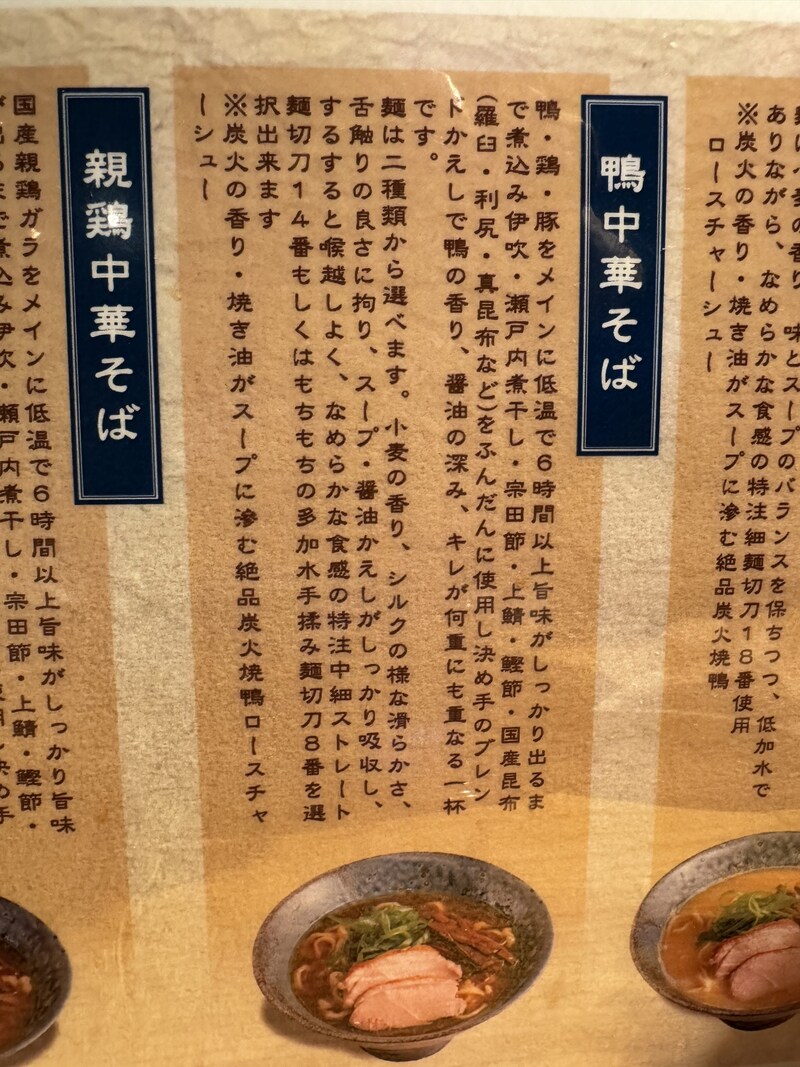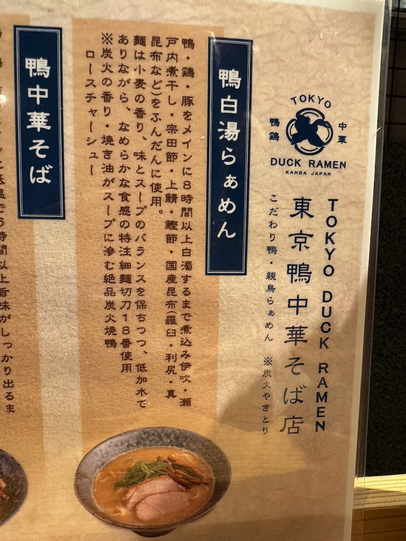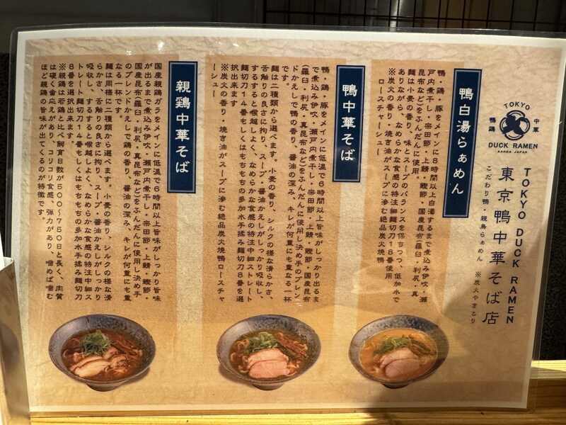 それぞれのラーメンに関する情報が目の前に貼られていました。鴨肉、鶏肉、豚肉を6時間も煮込んでいるとのこと。かなり時間をかけて調理をしているようです。こういうのを読むと、なんか美味しさが増幅する感じがしますよね。