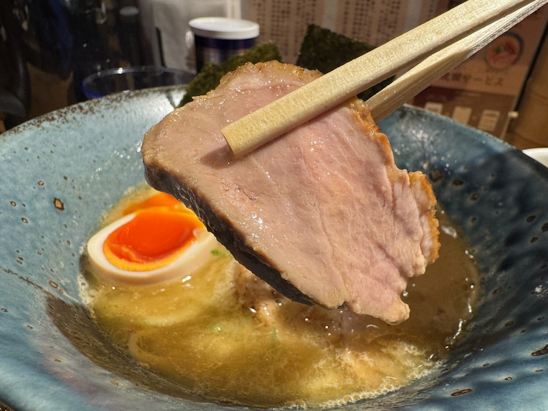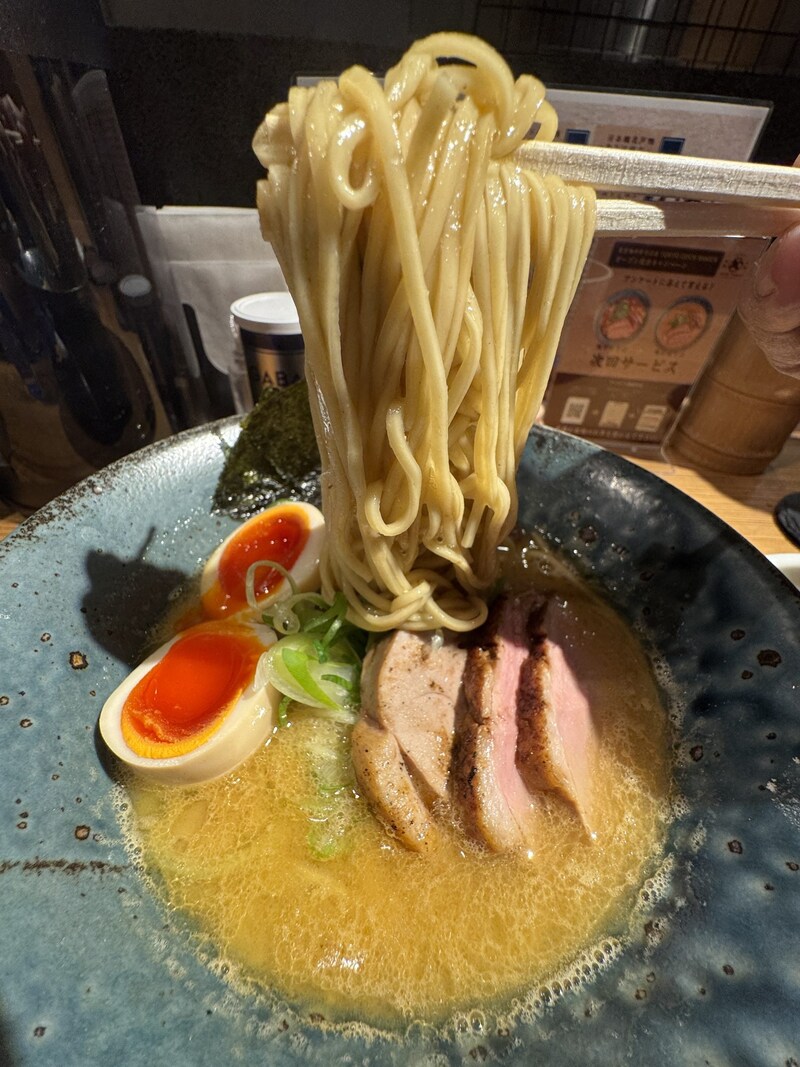 麺はかなり心地よいものでした。ツルツルしすぎない、いい塩梅で抵抗感のあるザラつき麺。それがスープをたっぷりととらえて、絶品ラーメンに仕上げてくれています。斬新さだけでなく、しっかり丁寧に作った、見かけ倒しではないラーメンといった印象。良いです。