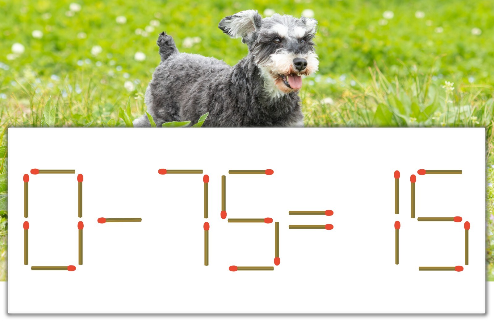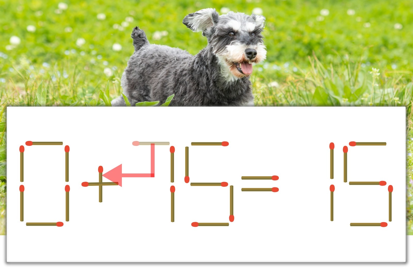 「7」を別の数字に変化させると答えが導き出せます。「7」のマッチ棒を1本移動して、「-」を「+」にしてみましょう。すると、「0+15=15」が成立します。