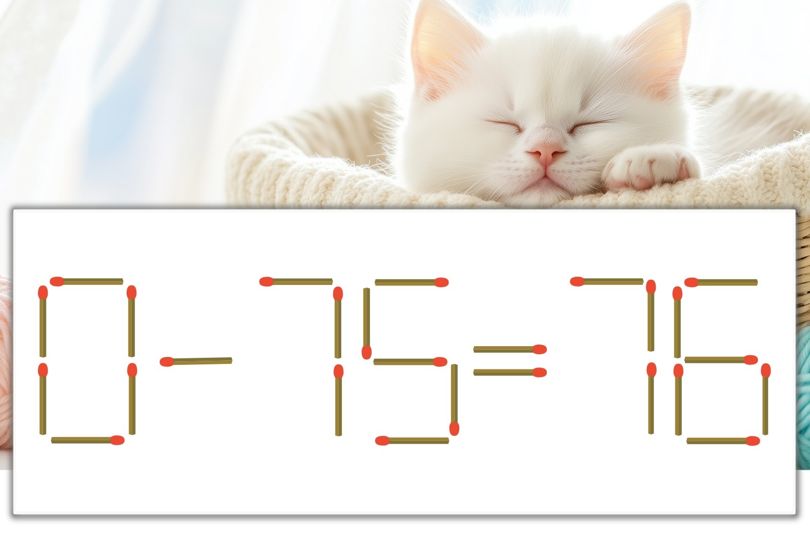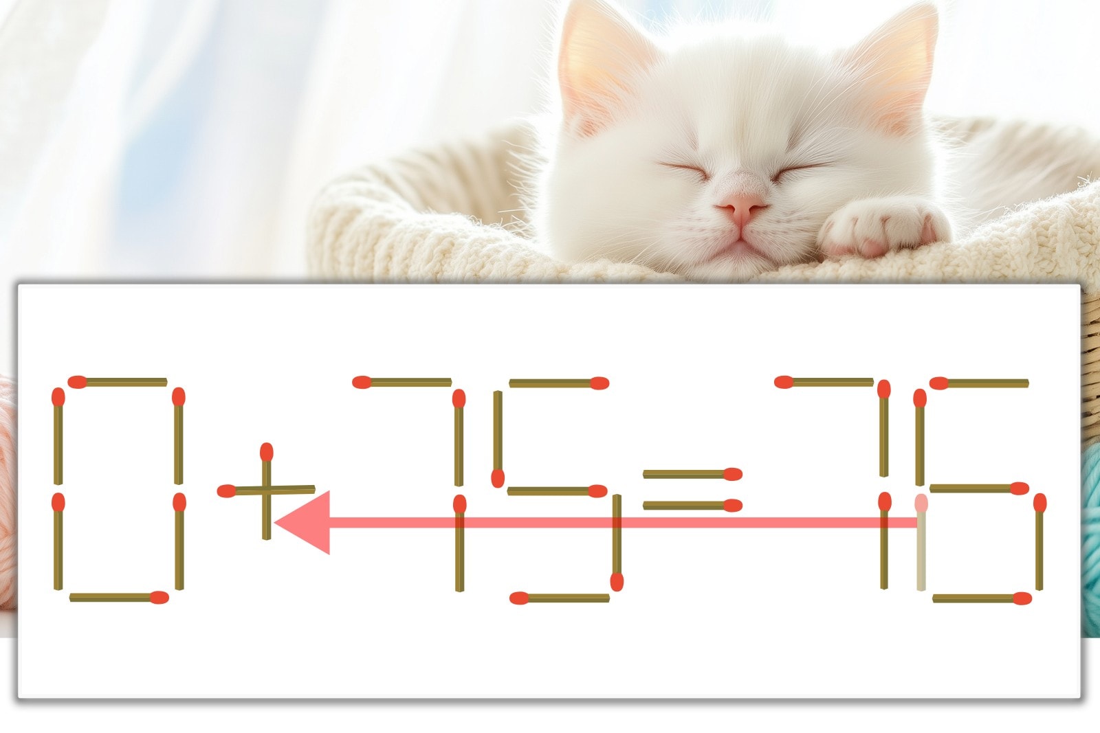 「6」を別の数字に変化させると答えが導き出せます。「6」のマッチ棒を1本移動して、「-」を「+」にしてみましょう。すると、「0+75=75」が成立します。