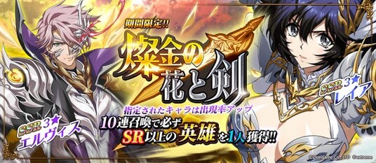 『燦金の花と剣』は10連召喚で必ずSR以上の英雄を一人獲得できる、期間限定召喚です。SSRエルヴィスとレイアの出現確率が期間限定でアップします。