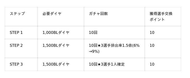 「<聖夜の軌跡>ステップアップ選手ガチャ」は無償BLダイヤでも挑戦いただけるステップアップガチャとなっており、STEP3で★3選手が1人「確定」で出現します。