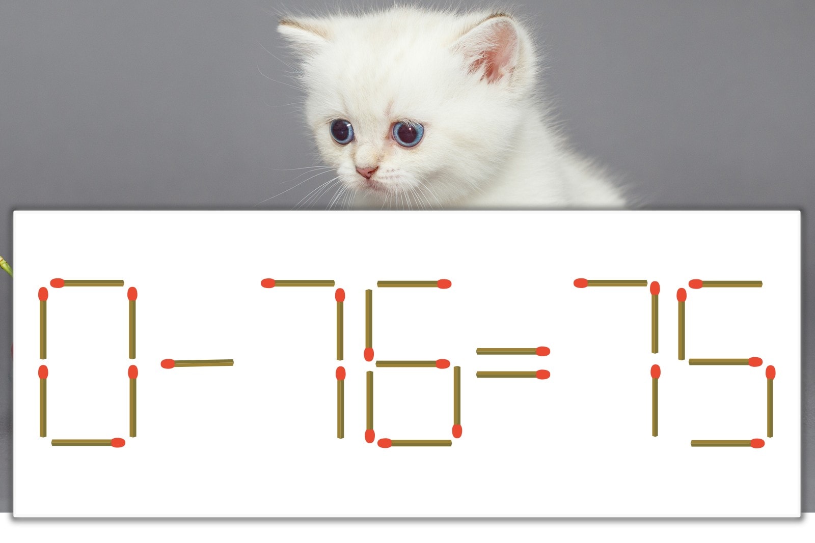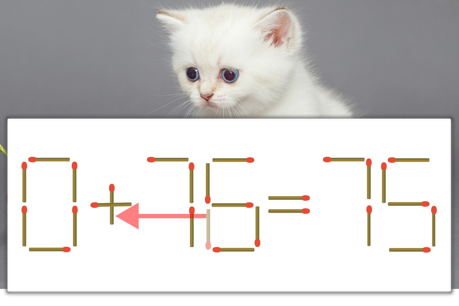 「6」を別の数字に変化させると答えが導き出せます。「6」のマッチ棒を1本移動して、「-」を「+」にしてみましょう。すると、「0+75=75」が成立します。