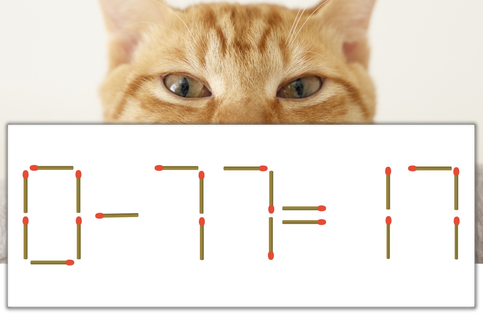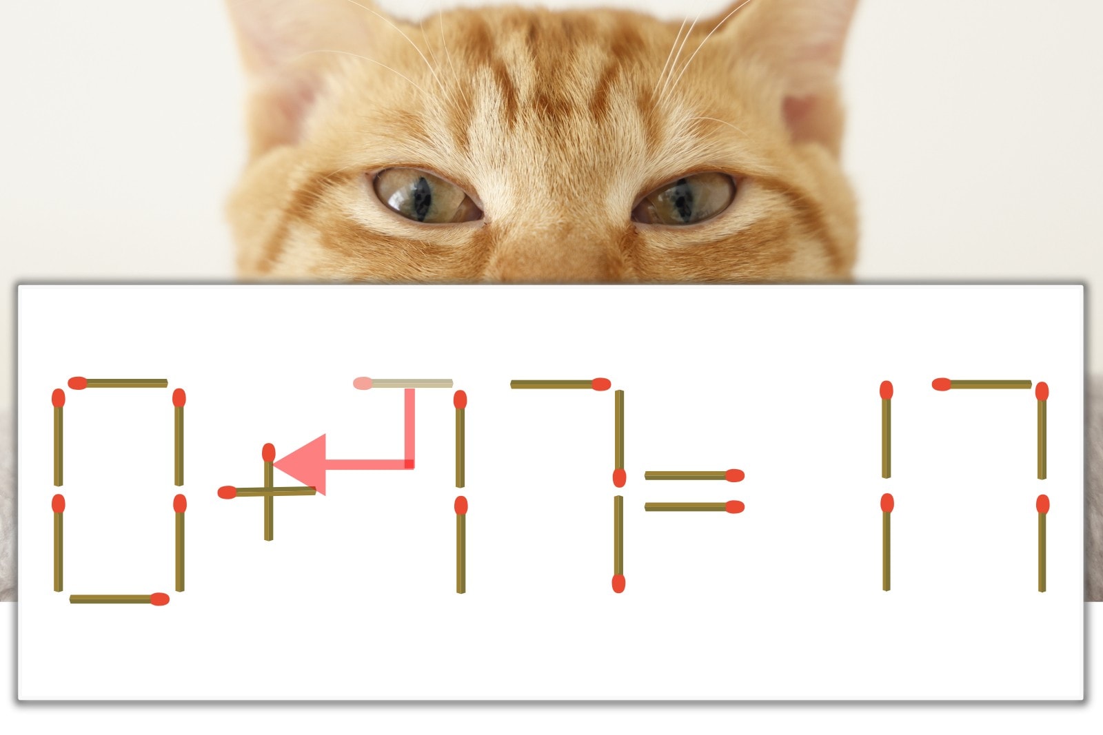 「7」を別の数字に変化させると答えが導き出せます。十の位の「7」のマッチ棒を1本移動して、「-」を「+」にしてみましょう。すると、「0+17=17」が成立します。