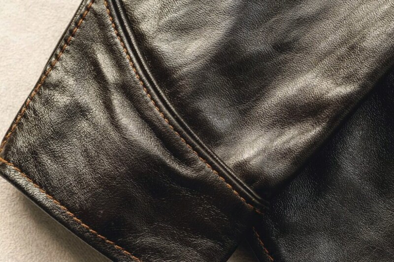 フラットヘッドの革ジャンのステッチは、太い茶色の糸で縫製される。茶芯とも相まって味わい深く変化する。