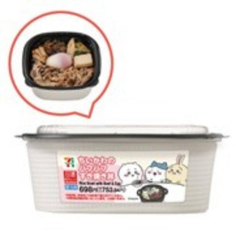 ちいかわが当選したすき焼きセットをイメージ。甘じょっぱい牛肉と野菜に温泉玉子をトッピングしています。