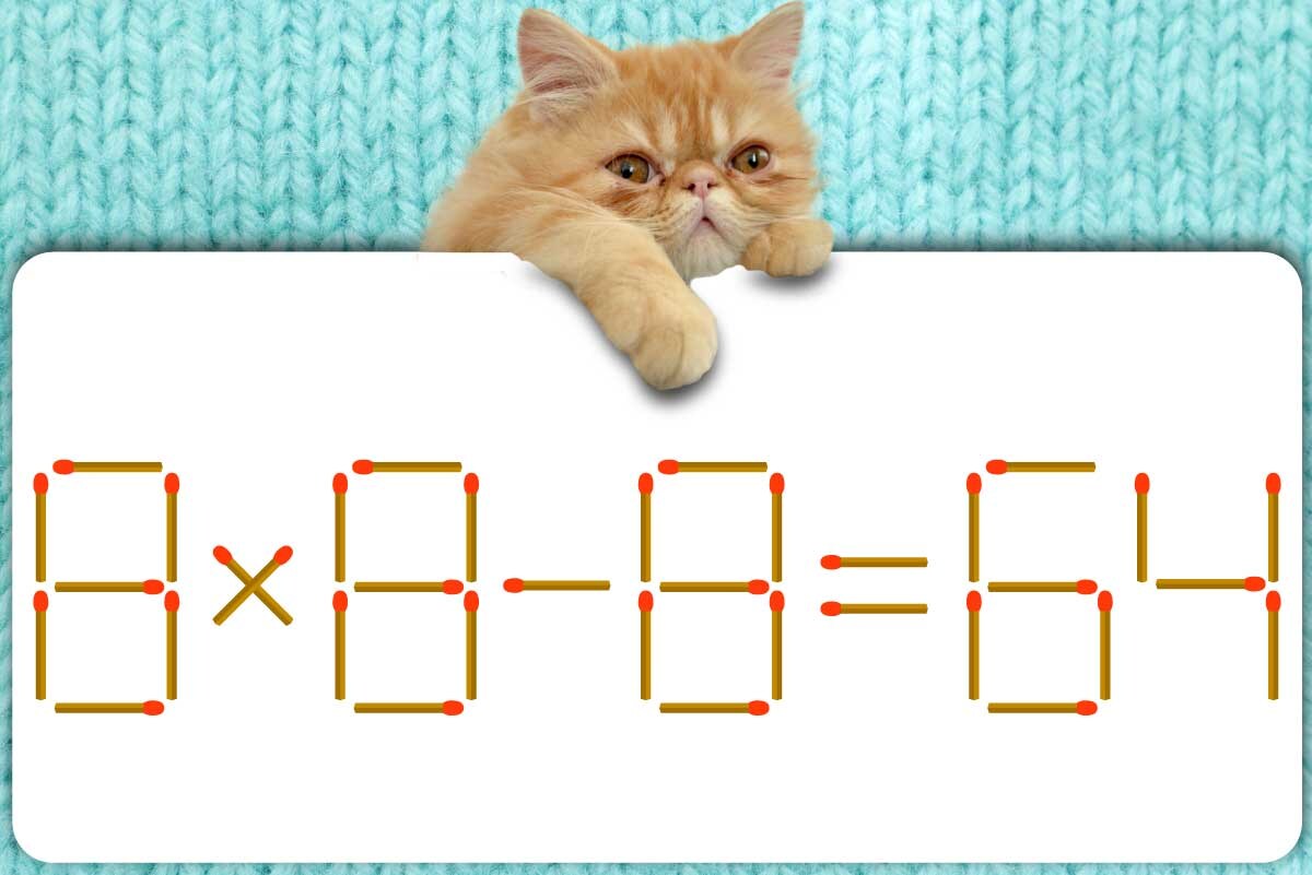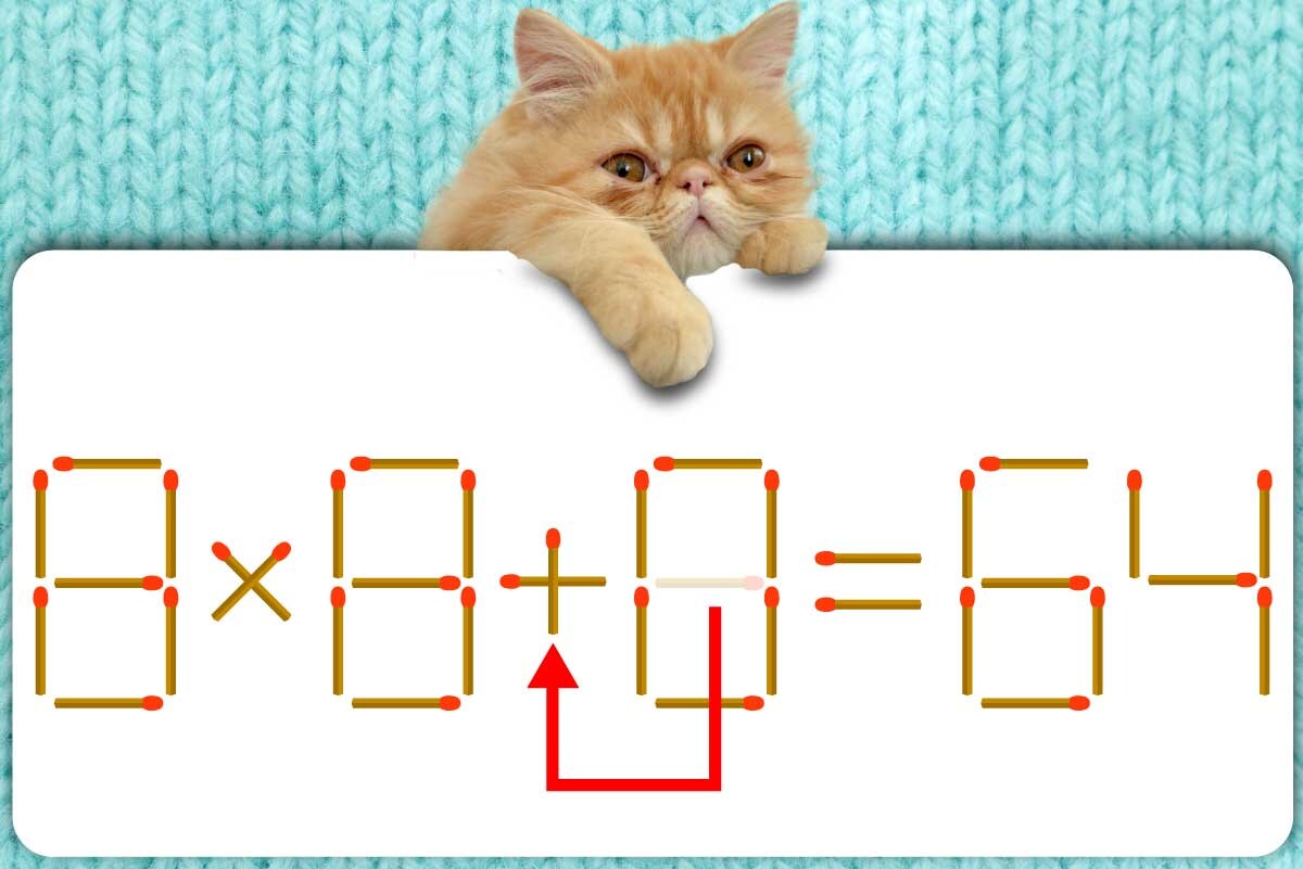 「8」のマッチ棒を1本、「-」に移動させて「+」を作り、「8×8+0=64」にする。※解答は複数ある場合があります。