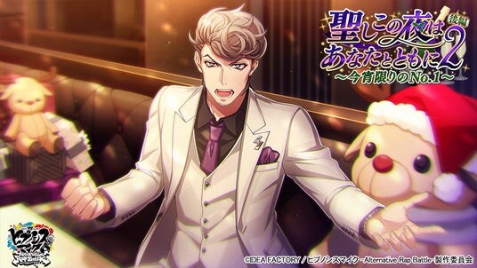 スマートフォン向けゲームアプリ『ヒプノシスマイク -Alternative Rap Battle-』にて、イベント「聖しこの夜はあなたとともに2 後編~今宵限りのNo.1~」を本日開始いたしました。