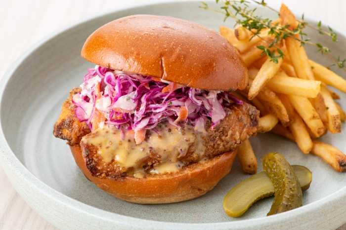 終日提供の「クリスピーフライドチキンバーガー」(2,200円・税込)は、ふんわりバンズにクリスピーチキンとコールスローを大胆にはさんだ、満足感たっぷりのバーガーです。