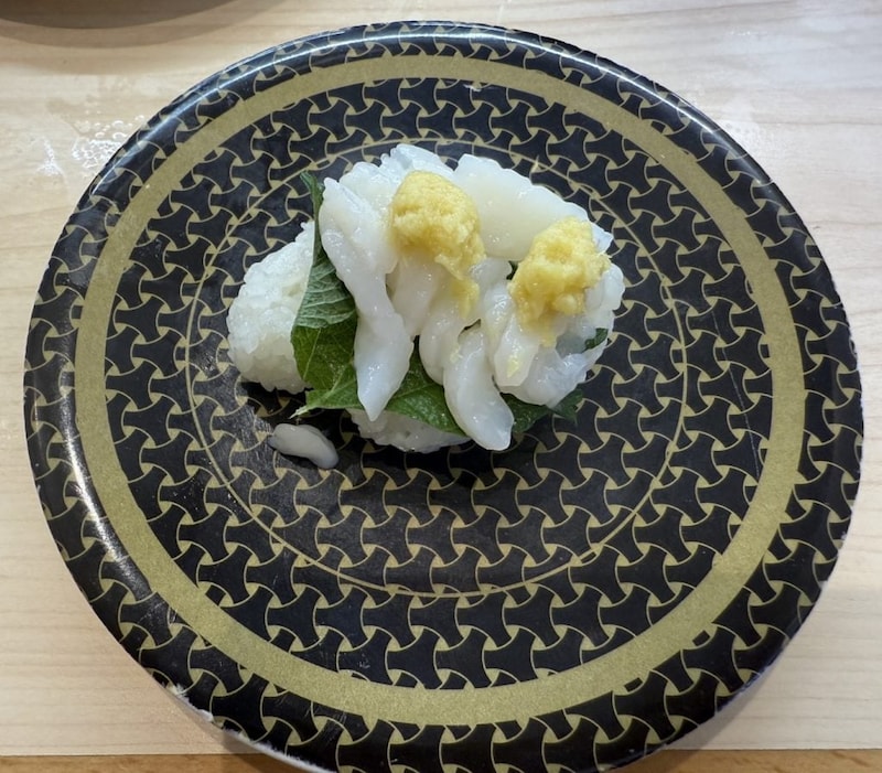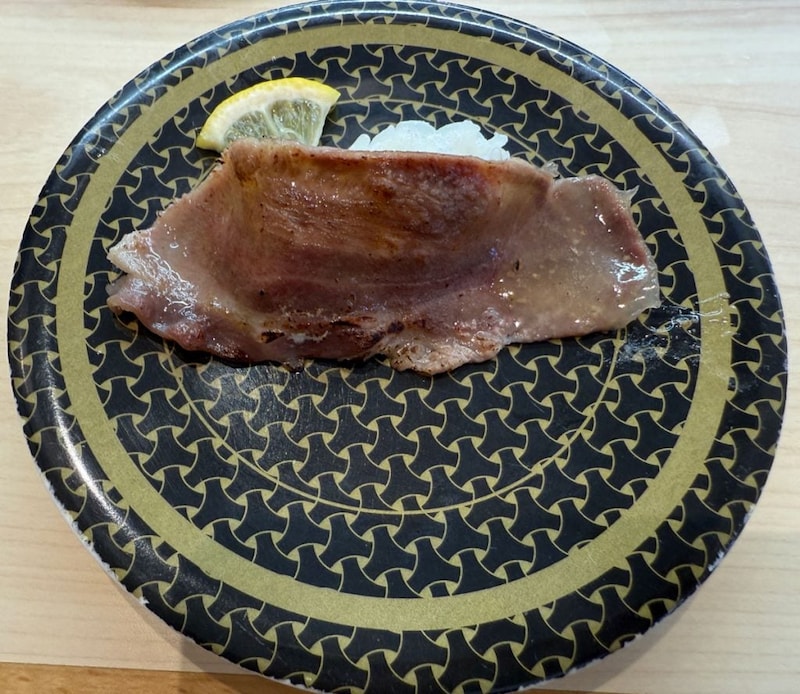炙り豚タン(100円)。個人的に豚タンは好きなのだが、寿司ダネで食べる発想はなかった。変わりダネであるが薄く切って炙った豚タン、付属のレモンをちょいとつけて食べるとなかなかイケる。ビールなどのお酒を飲む人にはピッタリかも。