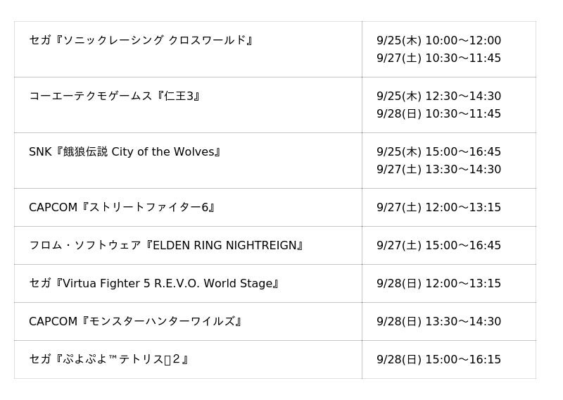 発売前のCAPCOM『PRAGMATA』、コーエーテクモゲームス『仁王3』、セガ『ソニックレーシング クロスワールド』、スクウェア・エニックス『ファイナルファンタジータクティクス - イヴァリース クロニクルズ』試遊やSNK『餓狼伝説 City of the Wolves』DLCキャラクター「ジョー・東」の先行試遊など計10タイトルの試遊台をご用意しています。