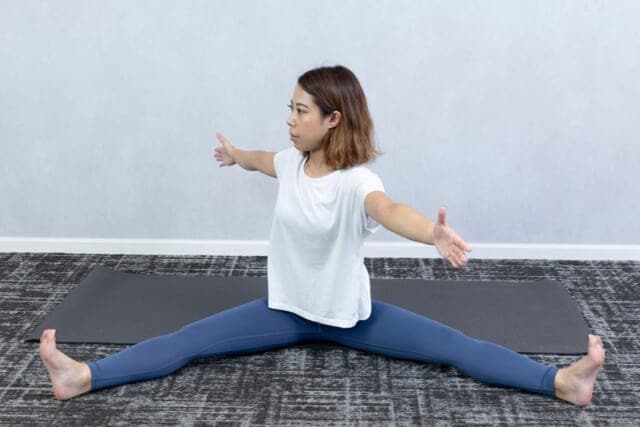(1)しっかりと骨盤を立てて両脚を開き、両腕を床と水平にまっすぐ伸ばす