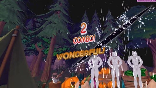 1)”マッチョな猫”がVR上に出現し、食材を投げます。剣を操作して、その食材を斬りつける。