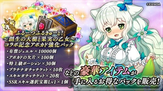 さらに「『ふるーつふるきゅーと! ~創生の大樹と果実の乙女~』コラボ記念 アボカド確定パック」を購入すると「『ふるーつふるきゅーと! ~創生の大樹と果実の乙女~』コラボ記念 アボカド強化パック」が購入可能になります!こちらの商品では「アボカドの欠片」や有償ジュエルに加えて、「プラチナガチャチケット」や「SSRスキル選択宝箱」、「特上級ポーション」など様々な豪華アイテムをお得に獲得することができます!