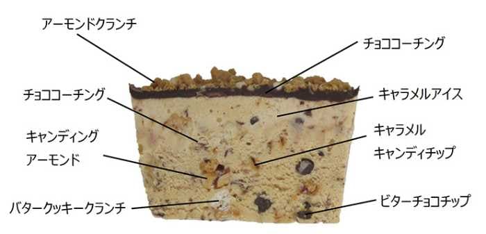 キャラメルアイスの中には「キャンディングアーモンド・チョコチップ・キャラメルキャンディチップ・バタークッキークランチ・チョココーチング」の5種をたっぷりブレンド。