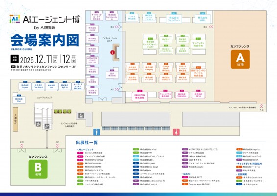 国内最大級のAIポータルメディア「AIsmiley」を運営する株式会社アイスマイリー(東京都渋谷区、代表取締役:板羽 晃司)は、最先端AIが集結する次世代技術の祭典「AIエージェント博 by AI博覧会」を2025年12月11日(木)~2025年12月12日(金)の2日間、御茶ノ水ソラシティカンファレンスセンター2Fで開催します。本日、カンファレンス登壇者全34名と会場フロアマップを公開しました。