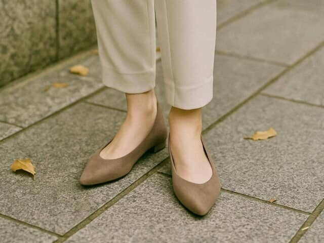 季節感を出すなら、まずは足元から。おすすめはパンプスやバレエシューズなど、甲が見える軽やかなデザインを“スエード調”の素材で選ぶこと。ベージュやチャコールグレーなど落ち着いたトーンなら夏コーデにもなじみつつ、ぐっと秋っぽさを添えてくれます。