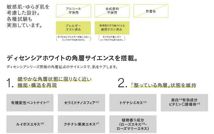 販売名はディセンシアホワイト スパイク―VCローション。125mL・6,050円(税込)、リフィル125mL・5,720円(税込)。敏感肌のための処方で、毎日のケアに取り入れやすいバランスも魅力です。