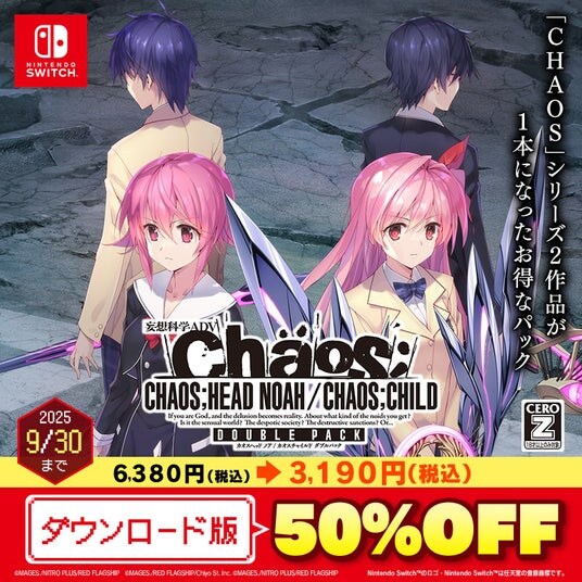 本編の『CHAOS;HEAD NOAH』と『CHAOS;CHILD』は、同じくダブルパックとなっており、Nintendo Switch(TM)用として発売中で、CERO「Z」(18才以上のみ対象)に区分されています。現在本作は、ニンテンドーeショップにて9月30日まで期間限定セールを実施中です。