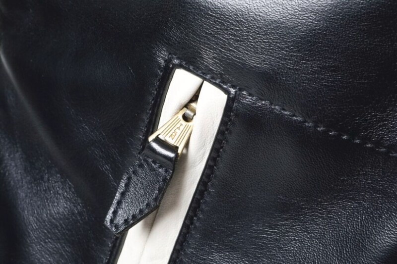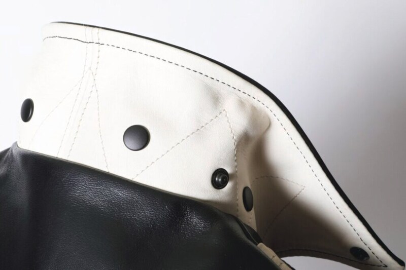 要所に使われている白いホースハイドは、経年変化も楽しみなポイント。ムートンエリはスナップボタンで着脱可能なので、季節などで使い分けられる点もうれしい。