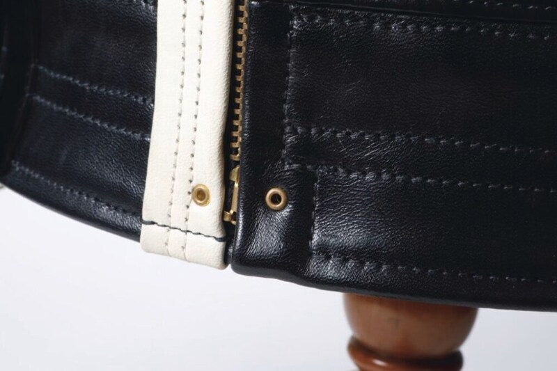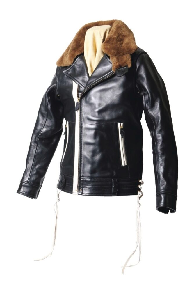 最新作となるジャケットは、ツートーンの馬革を使った、ムートンエリ付きのダブルライダース。サンプリングした個体は「POLICEMAN JACKET」と呼ばれるスーパーヴィンテージで、いまや幻といわれるほど。ポケット口など、程よい配分で白い革が使われているため、着こなしに採り入れやすい。32万7800円