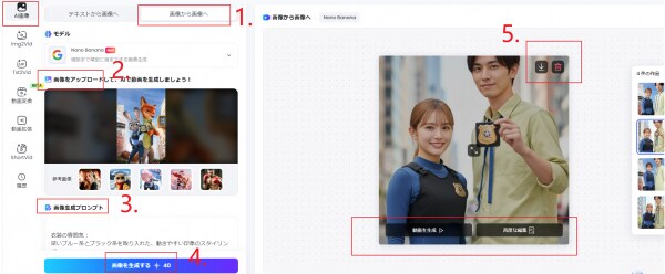 生成した画像から「動画を生成」機能を通じて動画制作ページへ移動し、AIが自動でカメラワークや動き、表情変化などを付与した短尺動画を生成できます。
