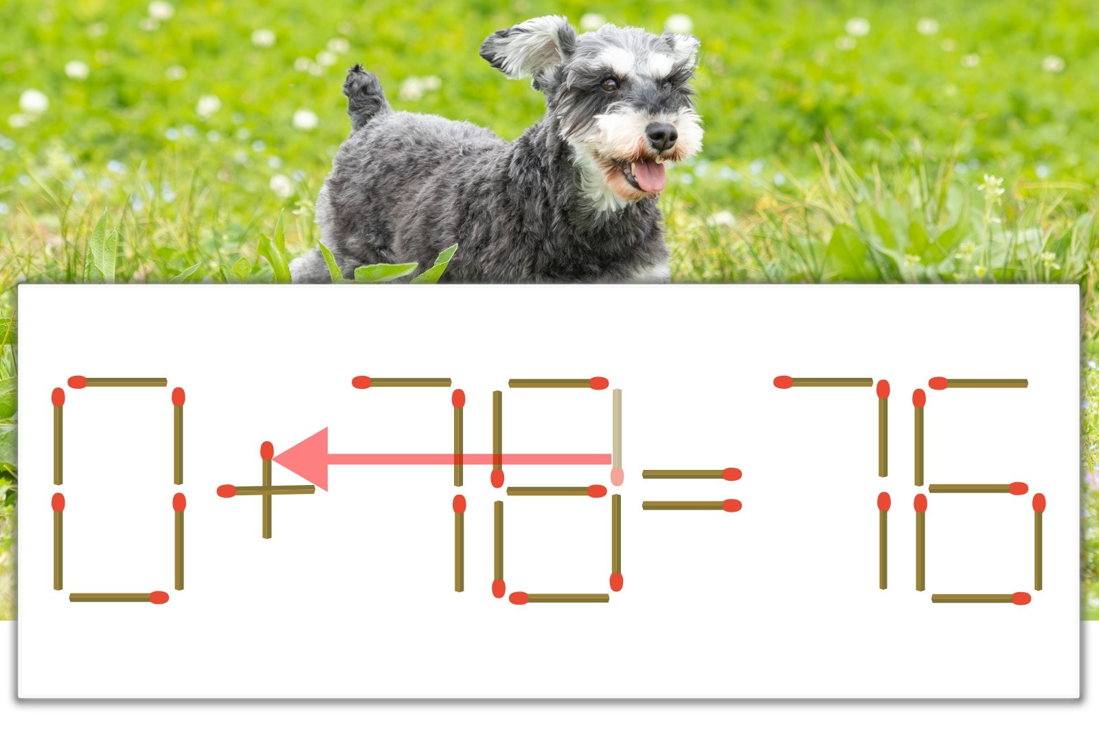 「8」を別の数字に変化させると答えが導き出せます。「8」のマッチ棒を1本移動して、「-」を「+」にしてみましょう。すると、「0+76=76」が成立します。
