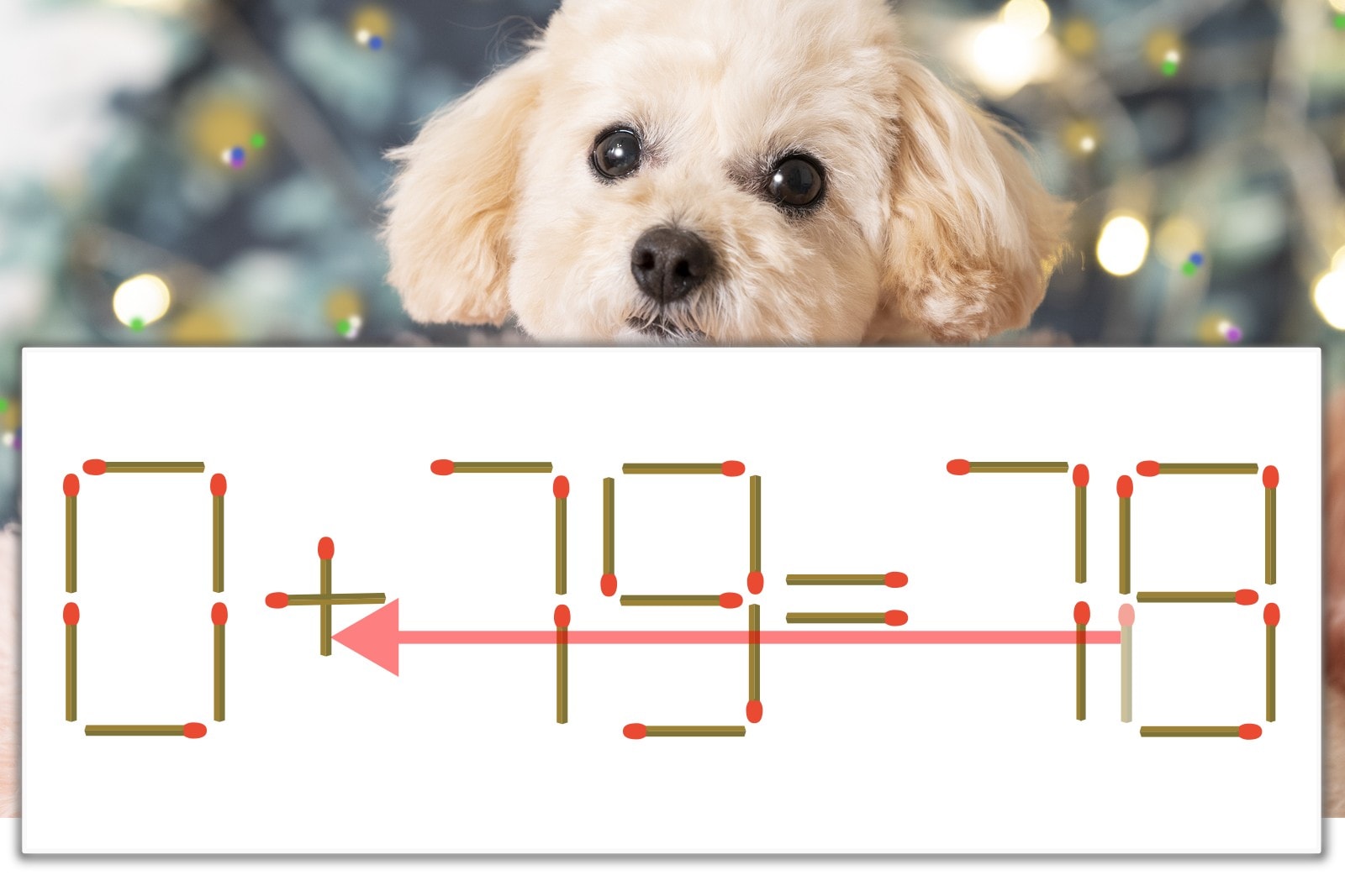 「8」を別の数字に変化させると答えが導き出せます。「8」のマッチ棒を1本移動して、「-」を「+」にしてみましょう。すると、「0+79=79」が成立します。