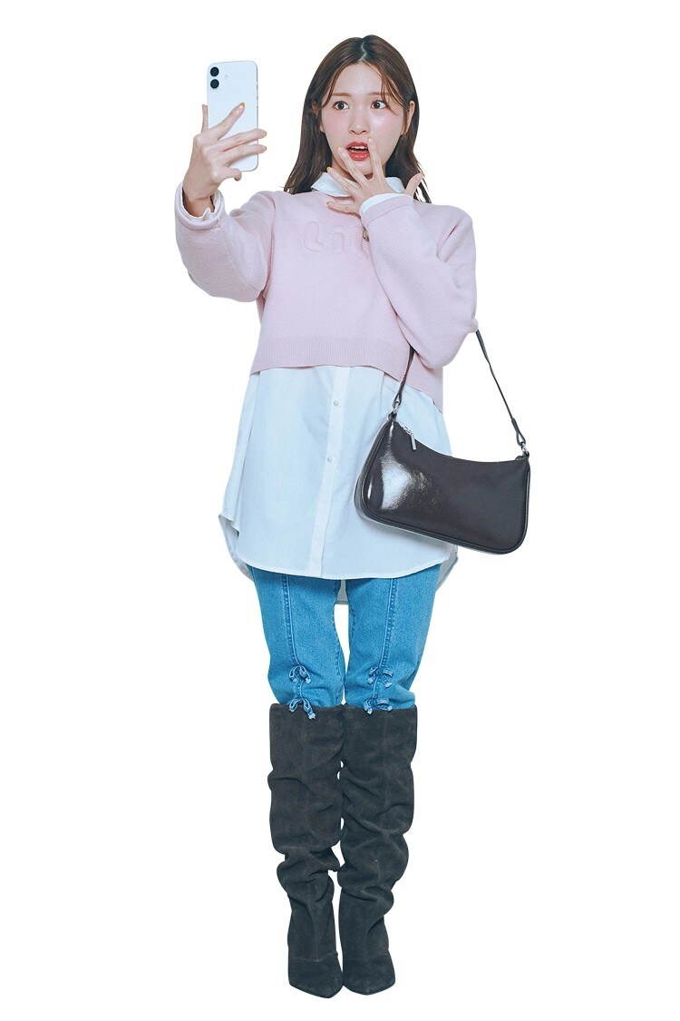 ニットとシャツを重ねた定番スタイルは、小物でひと癖加えるのがおしゃれ♡ ロングブーツとバッグの色は、シンプルな黒を選んで統一感を。