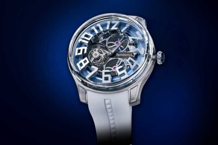 Tendenceの新作「TOURBILLION」の新色は、深い青を基調にしたデザイン。インナーリングとリューズに施されたブルーのアクセントが、時計全体に洗練された輝きを与えています。