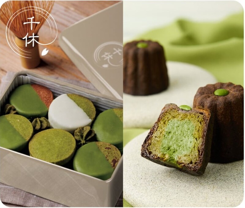 左から、東京・銀座「千休」の「抹茶チョコレートクッキー缶」(24枚入り/3,981円)、「抹茶玄米カヌレ」(1個/591円)