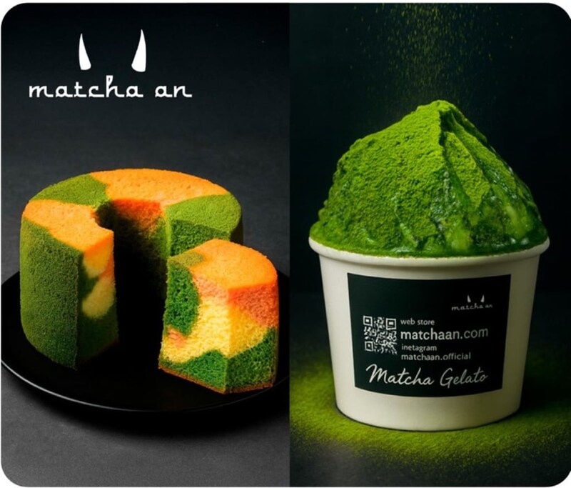 左から、福井・坂井「matcha an」の「抹茶の濃淡が織りなす茶奏マーブルシフォン」(1ホール/2,650円、季節限定品)、「Matcha Gelato Duo」(1個/800円、阪神梅田本店限定)※12月17日(水)~12月19日(金)出店
