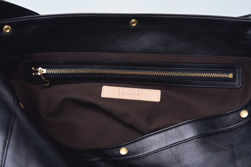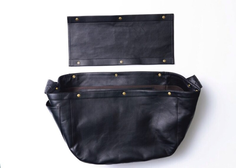 本来は大胆なグラフィックが特徴のニュースペーパーバッグを潔く茶芯ホースハイドで再構築。革ジャンを作るのと変わらないほどの量の馬革を贅沢に使用しており、モヒカン小川の言葉を借りると「言うならば背負える革ジャン」。普段使いはもちろんのこと、数泊の出張にも持っていけるほどの大容量を誇る。