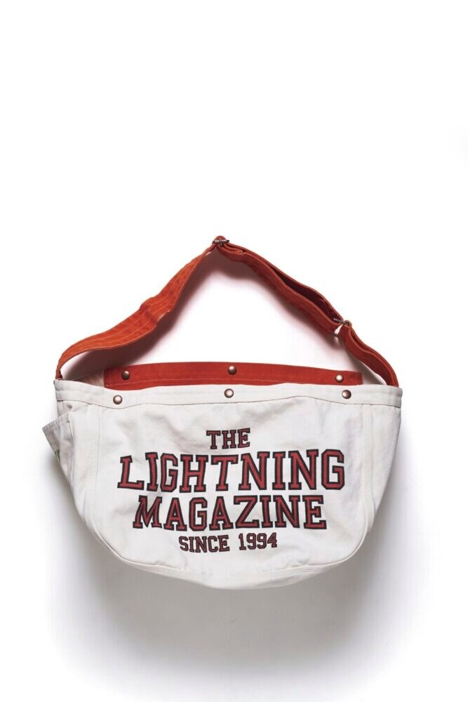 このニュースペーパーバッグのデザインソースはヴィンテージのニュースペーパーバッグを参考にライトニングが製作したこのバッグ。長さが調整できるベルト、取り外しが可能なカバーが付くなど、機能性も申し分なく、大人気のアイテムであった。ちなみにサイズは縦約35㎝、横約45㎝、マチ約28㎝と非常に大容量で、撮影物を運ぶ際の“衣装バッグ”として使うもの編集部員もいた。
