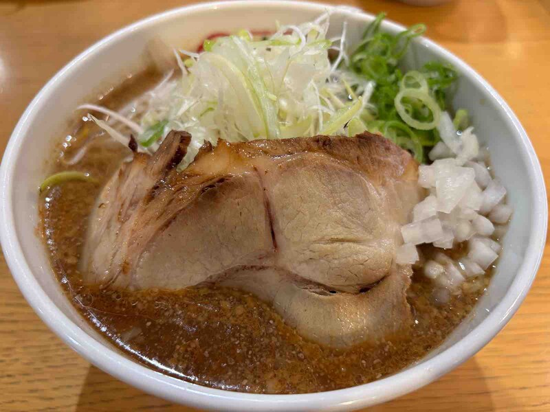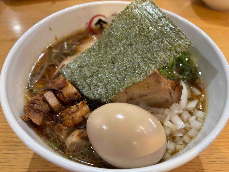 「特製黒雲」を注文。具はチャーシュー、細切れチャーシュー、味玉、モヤシ、刻みタマネギ、青ネギ、ノリ。麺は中太ストレート。スープは豚骨と鶏ガラのダブルで、醤油はカネシ醤油と鹿児島の甘めの醤油を合わせている。甘めのあと引く醤油スープに揚げネギを合わせており、中毒性もバツグンだ。具材もバラエティに富んでいるが、薬味類がいい仕事をしていて飽きずに食べられる。