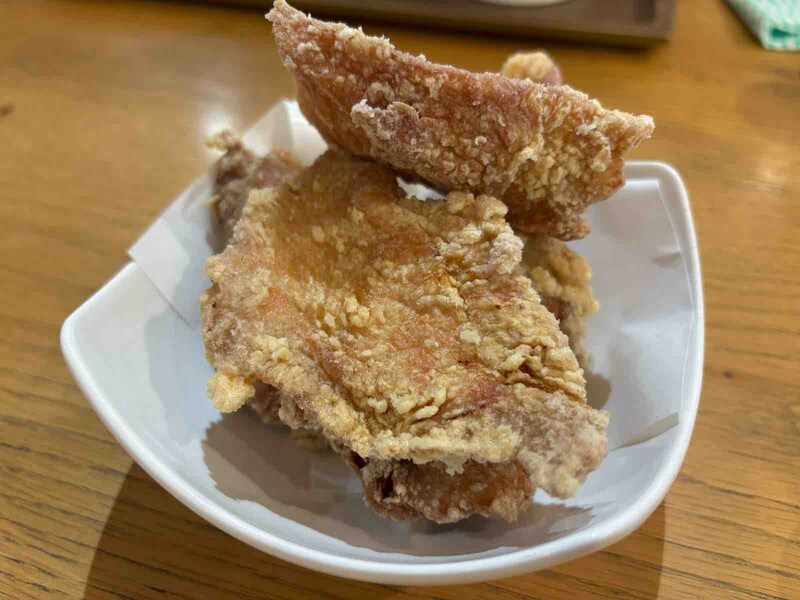 自家製唐揚げ(4個)もオススメ。モモとムネが2個ずつ入っていて、食べ比べも楽しい。竜田揚げっぽい仕上がりで揚げたてでとても美味しい。