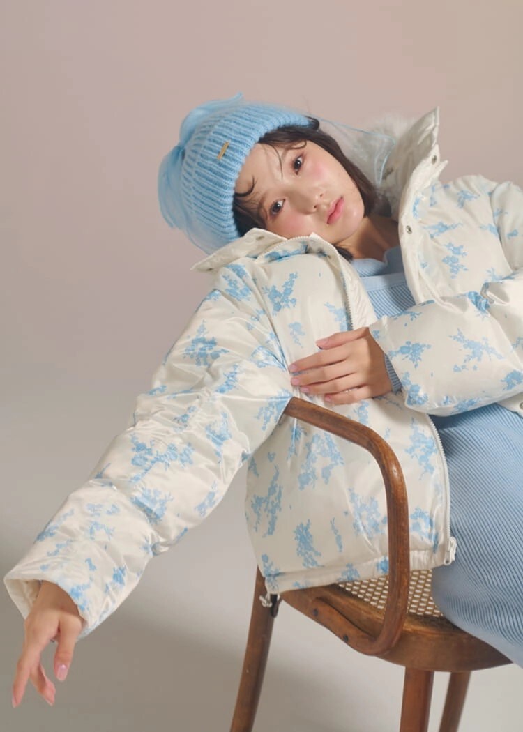 Cordinate ブルーのお花が華やかなぷりかわダウンにひと目ぼれ